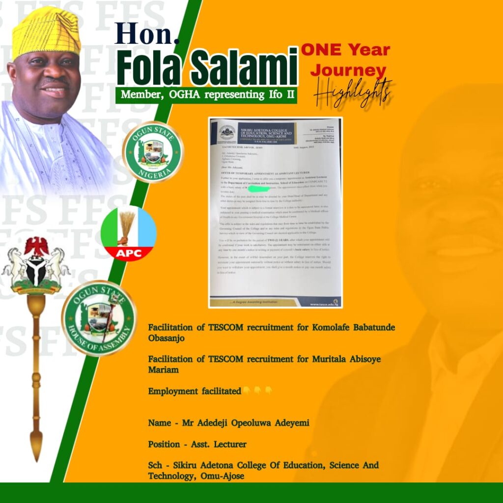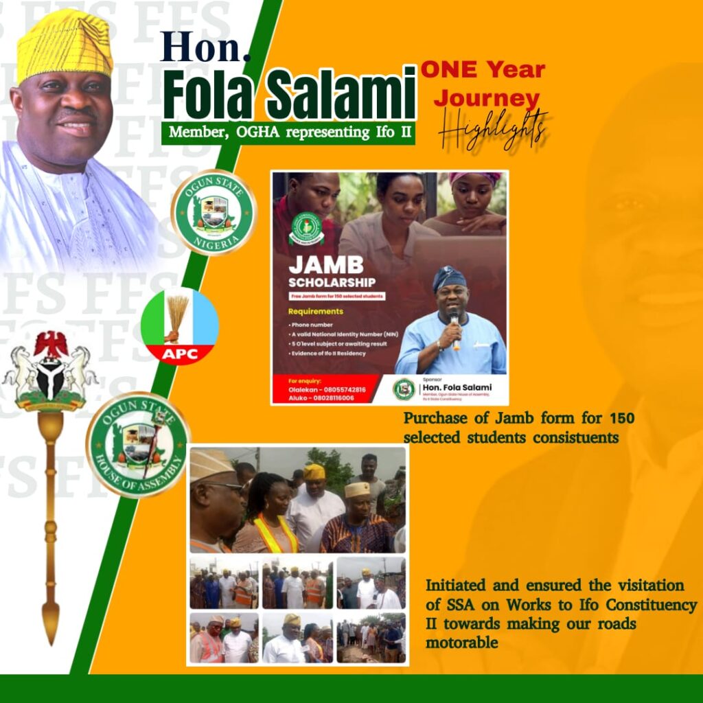 n his first year in office, Hon. Fola Salami has made significant strides in enhancing educational opportunities for his constituents. He purchased 150 free JAMB forms, easing the financial burden on families and providing students with the chance to further their education.