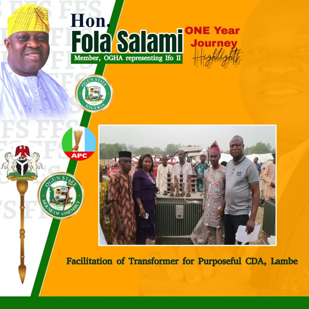 Hon. Salami has also focused on improving local infrastructure and utilities. He further facilitated the provision of a 500KVA transformer for use by Purposeful Community Development Association (CDA) in Olambe to improve electricity supply.